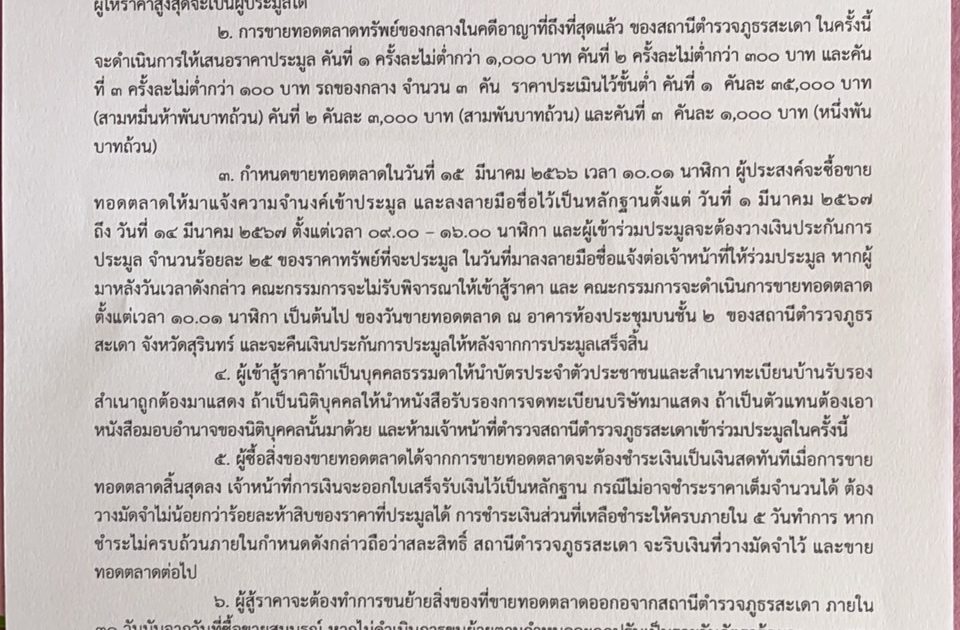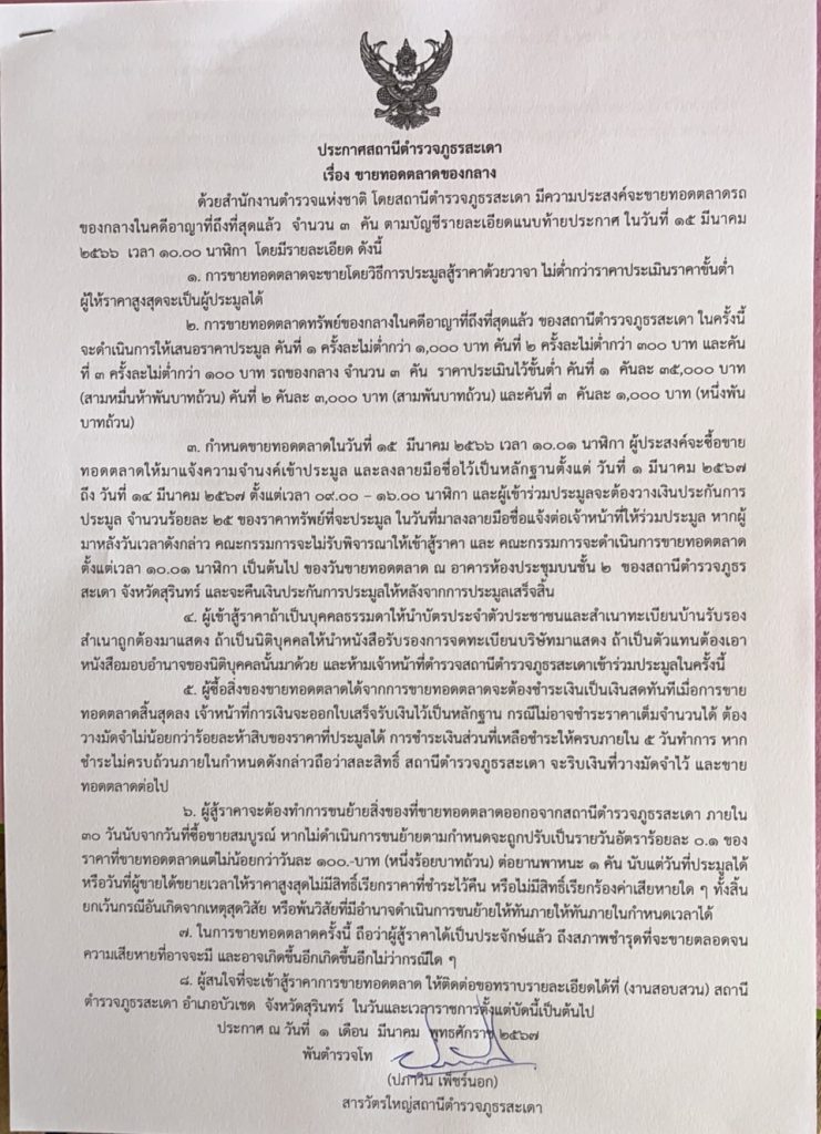 สถานีตำรวจภูธรสะเดา ประกาศขายทอดตลาดของกลาง ในคดีอาญาถึงที่สุดแล้วจำนวน 3 รายการ โดยวิธีการประมูลต่อสู้ราคาด้วยวาจา กำหนดขายทอดตลาดในวันที่ 15 มีนาคม 2567 เวลา 10.01 น. ผู้ประสงค์จะซื้อ ขายทอดตลาดให้มาแจ้งความจำนงเข้าประมูล และลงลายมือชื่อไว้เป็นหลักฐานตั้งแต่วันที่ 1 มีนาคม 2567 ถึงวันที่ 14 มีนาคม 2567 ตั้งแต่เวลา 09.00 – 16.00 น รายละเอียดเพิ่มเติมตามประกาศด้านบนนี้