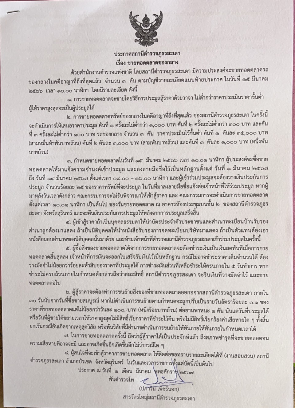 สถานีตำรวจภูธรสะเดา ประกาศขายทอดตลาดของกลาง ในคดีอาญาถึงที่สุดแล้วจำนวน 3 รายการ โด