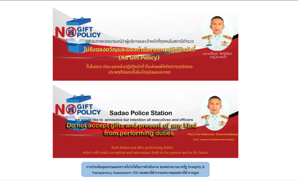 แสดงอินโฟกราฟิกนโยบายไม่รับของขวัญและของกำนัล ทุกชนิด (No Gift Policy) จากการปฏิบัติหน้าที่ ทั้งภาษาไทย และภาษาอังกฤษ โดยให้แสดงไว้บนหน้าแรกของเว็บไซต์หลักของหน่วยงาน